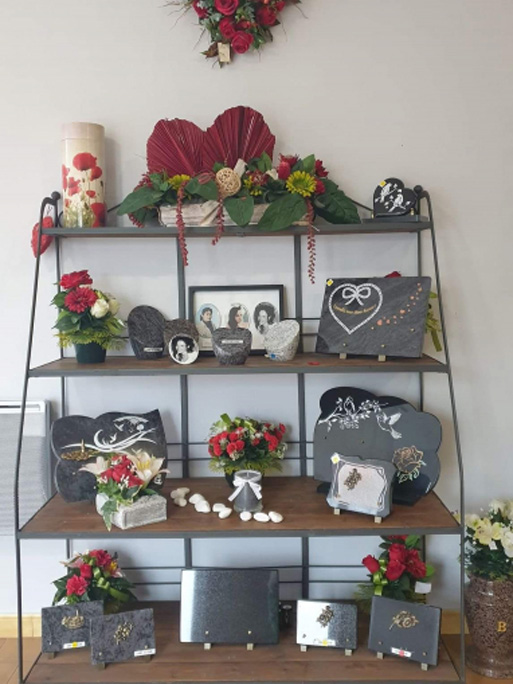 Dans notre magasin, nous proposons une large sélection d'articles funéraires pour honorer la mémoire de vos proches. De la décoration florale aux cercueils, nous mettons à votre disposition des produits adéquats. D’autre part, notre service de marbrerie vous offre la possibilité de personnaliser les monuments funéraires selon vos souhaits.